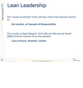 The document discusses lean leadership principles. A lean leader leads differently than traditional leaders by setting visions, building empowering systems, and influencing through coaching and questioning rather than dictating. A lean leader develops people by facilitating learning through tools like standardized work and the PDCA cycle. The lean leader's role is to get others to think and take initiative by asking questions, avoiding giving direct answers, and addressing barriers that discourage independent problem solving.