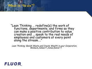 The document discusses lean methodology and its principles of eliminating waste and adding value. It defines lean as redefining work to positively contribute to value creation and meet customer needs. The goals of lean are to reduce costs, shorten lead times through flow, improve quality and customer responsiveness. Lean is based on the Toyota Production System and uses value stream mapping to eliminate waste and add value. The main lean elements discussed are 5S, continuous improvement (kaizen), pull systems (kanban), and identifying and reducing the seven wastes.