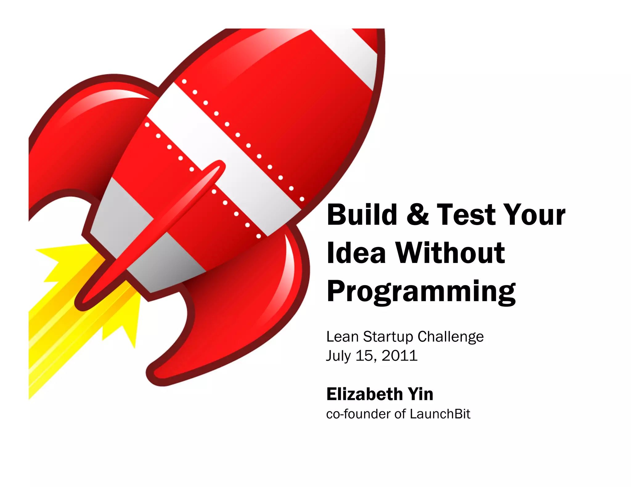The document discusses how to build and test new business ideas without programming using Lean Startup methodology. It recommends starting with customer interviews to understand needs, then creating "Wizard of Oz" prototypes to demonstrate the concept and get early feedback. Tools like basic landing pages, surveys, and analytics can be used to quickly collect initial user data, iterate on the minimum viable product, and evaluate the idea's viability within about a week. The process allows new entrepreneurs to efficiently test their ideas before investing heavily in development.