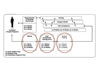 The document discusses how Toyota adopted lean principles in response to a crisis in the 1950s when it ran out of cash and fell under the control of bankers. Lean thinking was born out of Toyota's need to free up scarce cash, reduce costs, and enhance quality with little time. The document then discusses how lean principles have been applied successfully in other industries like software development to significantly reduce defects, effort, and duration of projects. It emphasizes that lean requires engaging people in problem solving and defining value from the customer's perspective to eliminate waste.