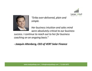 The document contains testimonials from several CEOs praising Erika's business consulting and sales skills. They note her ability to rapidly grow businesses and sign new agreements. Her strategic execution and laser focus on clients' goals are highlighted as being critical to the success of their organizations. Erika is described as going above and beyond, consistently delivering excellence, and making clients and partners feel like a team to drive results.