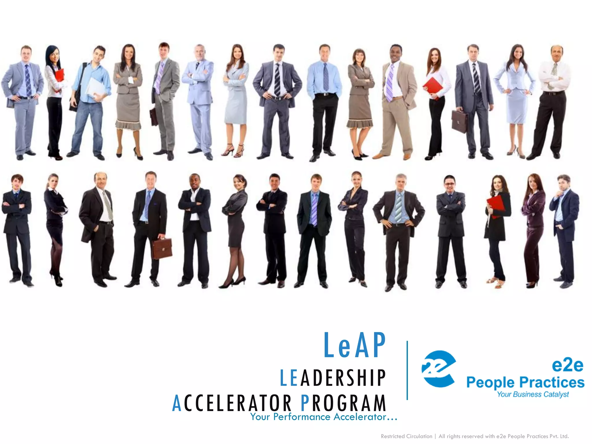 1) LeAP is a leadership accelerator program that aims to develop the mindset, self-awareness, and leadership behaviors of high performers through experiential learning opportunities, coaching, and customized reports.