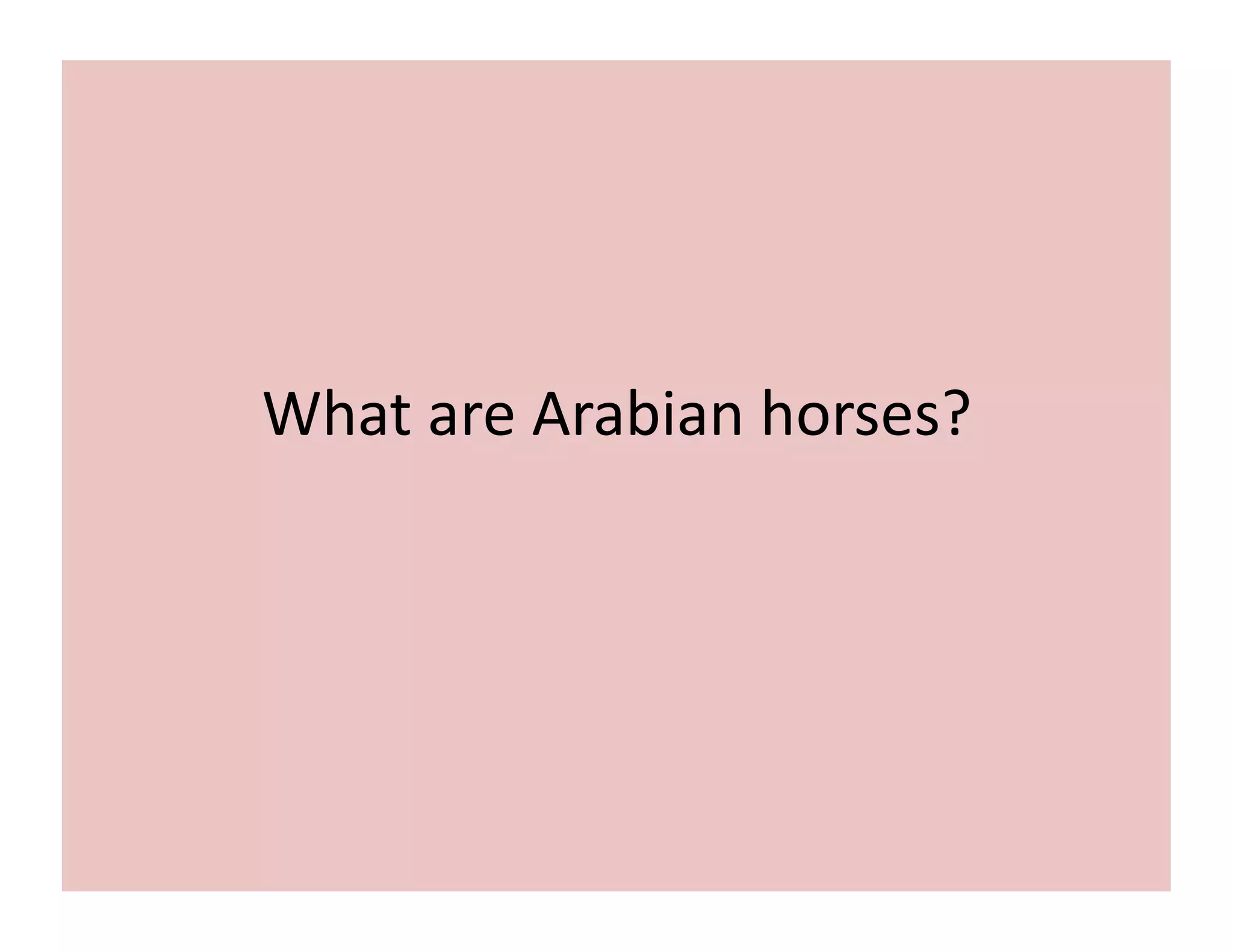 Arabian horses, originating from the Arabian Peninsula, are one of the oldest horse breeds, valued for their speed, strength, and intelligence. They are visually distinguished by their unique head shape and high carriage tail, and have a cooperative relationship with humans due to their selective breeding in harsh desert climates. Today, they excel in various equestrian competitions, particularly endurance racing, and have had a significant influence on horse development across civilizations.