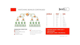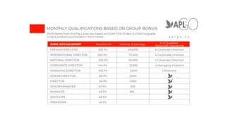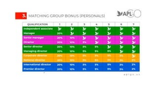 The document outlines a hybrid binary compensation plan with 11 ways to earn, including various bonuses such as start, group, matching group, and lifestyle bonuses. It details the structure of building up to 9 legs, each capped at $10,000 per week, and provides examples of earnings based on volume and different statuses. Additionally, it describes a unilevel bonus system with dynamic compression and qualifications necessary for earning.