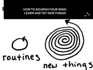 This document provides tips for nourishing your mind through learning new things. It recommends learning new skills which forces your brain to think differently and gain strength. Regularly reflecting on goals and making lists of things you want to learn can help you identify new subjects to study. A variety of methods exist for learning, such as watching online videos, reading, workshops, or asking others to teach you. The key is to continuously challenge yourself with new knowledge and to not let self-doubt stop your learning.