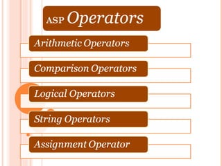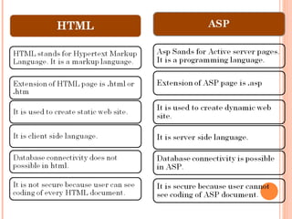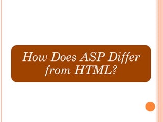 ASP is an active server page technology developed by Microsoft that allows web developers to build dynamic websites and web applications. ASP files can contain HTML tags, text, and scripting code. Scripts in ASP files are executed on the server rather than in the user's web browser. Common uses of ASP include dynamically generating and customizing web page content, accessing databases to display information to users, and providing more security since ASP code is not visible to users.
