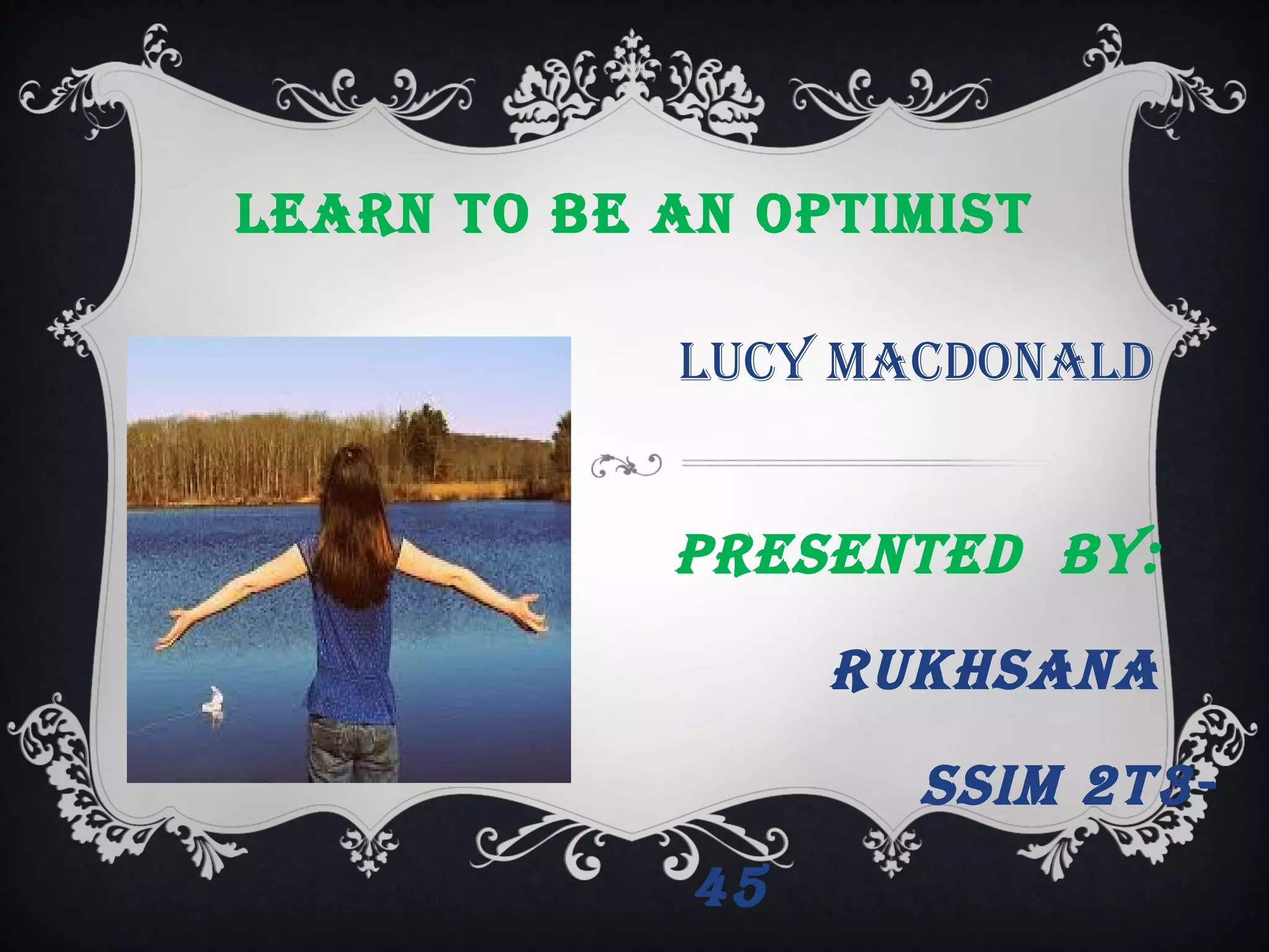 This document provides an overview of optimism and how to develop an optimistic mindset. It discusses key components of optimism like emotional intelligence, self-esteem, and resilience. An optimistic person believes positive events are personal, permanent, and pervasive, while blaming negative events on outside factors. Optimism can be learned and has benefits like better physical and mental health as well as improved stress management. The document encourages developing optimism through challenging negative thoughts, focusing on silver linings, and maintaining a positive daily affirmation.