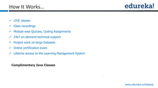 The document provides an overview of Edureka's Hadoop course, detailing weekly topics such as big data, HDFS, and data analytics tools like Pig and Hive, along with practical assignments and project work. It emphasizes the importance of big data across industries, showcasing its implications for competition and operational efficiency. Additionally, it outlines the Hadoop ecosystem, its core components, and its advantages in processing large datasets.