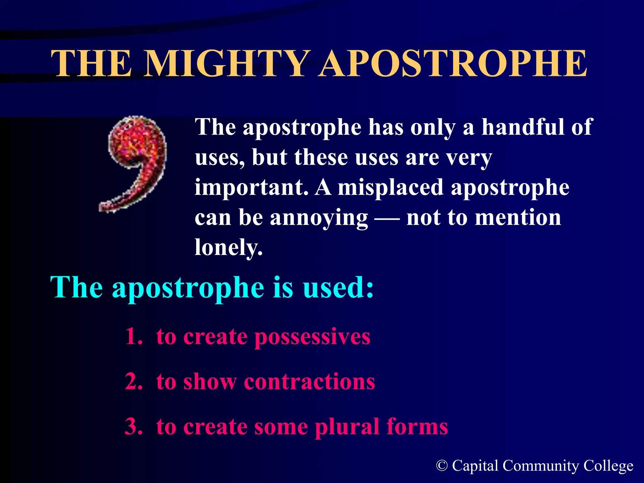 The document discusses the proper uses of apostrophes, which include forming possessives of nouns, showing contractions of words, and making some plurals. It provides examples for each use, such as forming possessives for singular and plural nouns like "the mayor's car" and "the Kennedys' house." It also discusses forming contractions in verbs and omitting letters, like "I'm" for "I am." The apostrophe is used carefully to avoid confusion over meaning.