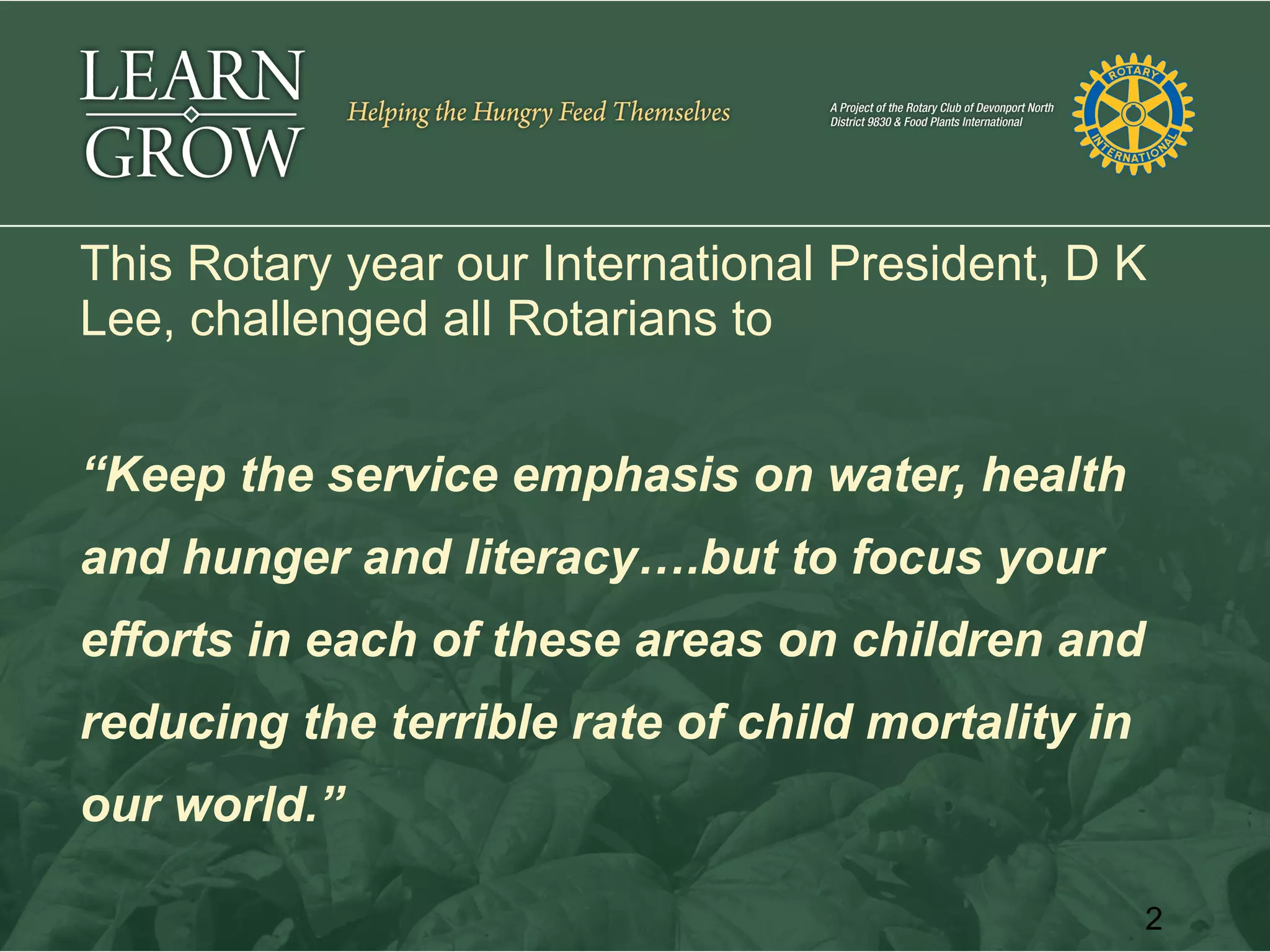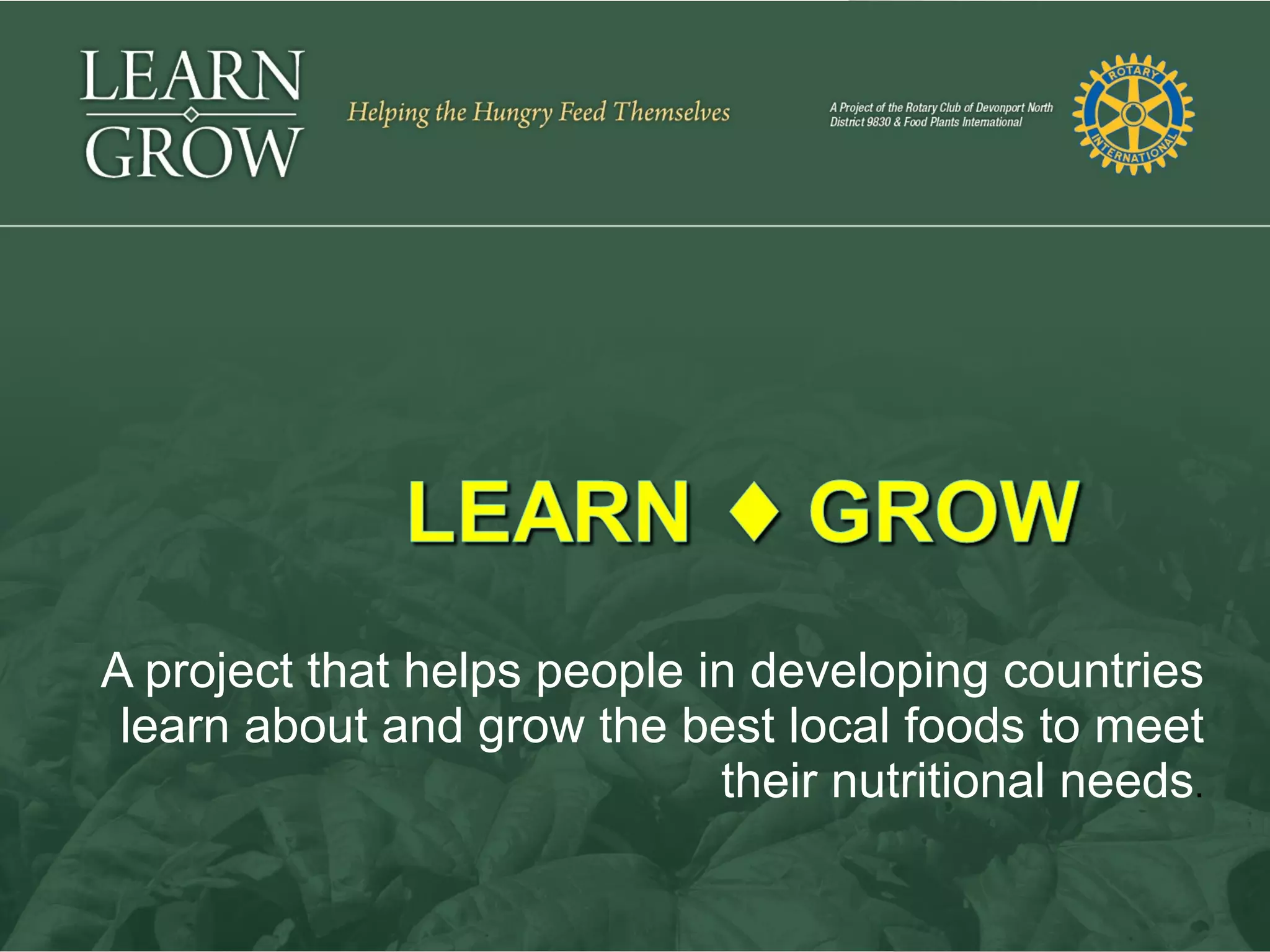 This document describes the Learn ♦ Grow project, a Rotary initiative that helps communities in developing countries learn about and grow nutritious local foods. The project addresses malnutrition by teaching people to cultivate indigenous plants scientifically shown to be highly nutritious alternatives to Western crops. Learn ♦ Grow provides information from a database of over 18,000 edible species to identify appropriate local foods for different regions. The goal is to sustainably reduce malnutrition, illness, disease, and mortality from nutritional deficiencies by empowering communities to feed themselves.