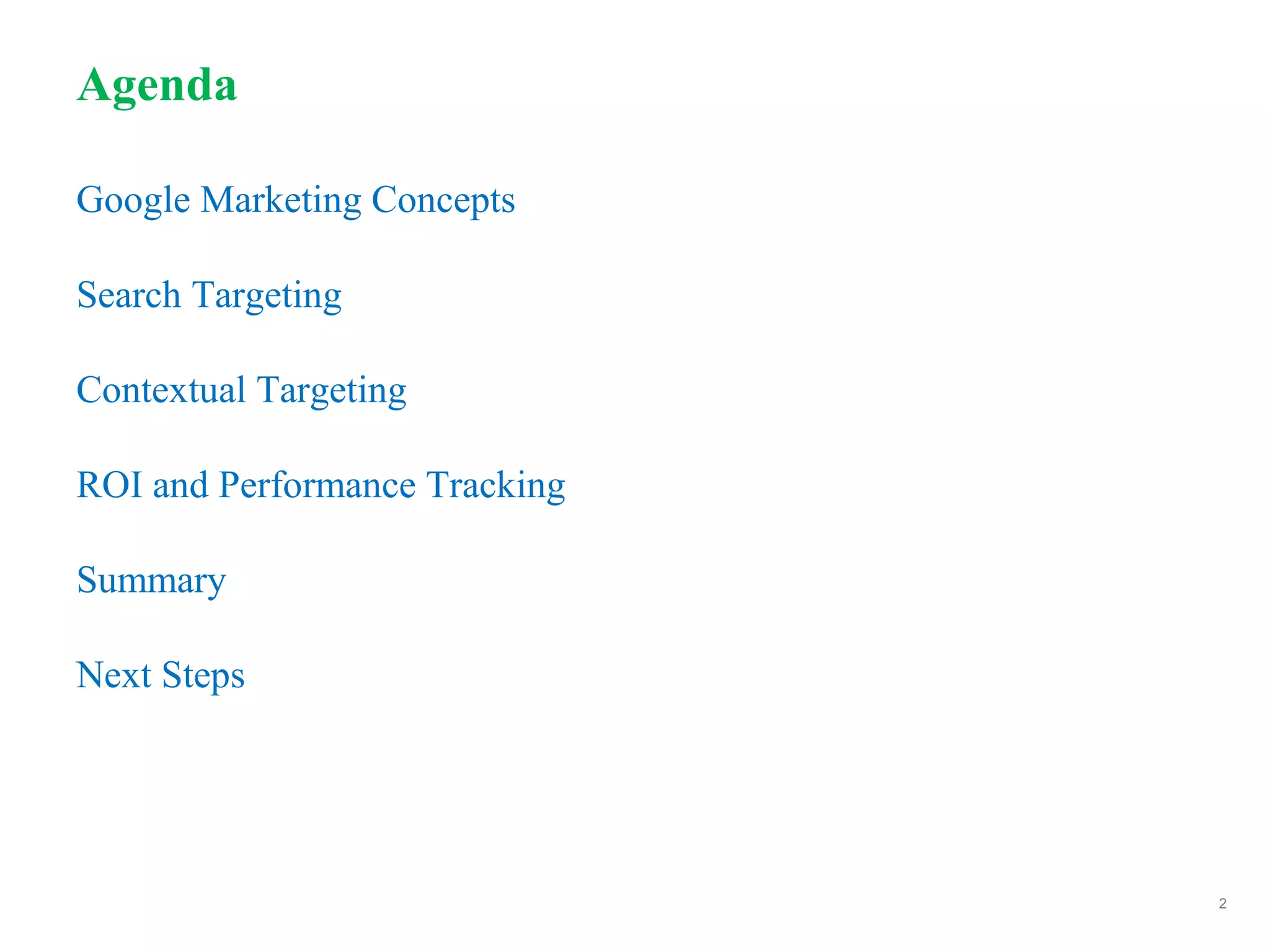 The document outlines Google marketing concepts, emphasizing search targeting, contextual targeting, and ROI tracking to effectively reach customers through online advertising. It describes how targeted advertising works, the benefits of using the Google Content Network, and the steps involved in setting up and managing an advertising campaign. Key offerings include professional consultation, account setup, and ongoing support for optimizing campaigns to maximize clicks and improve brand visibility.