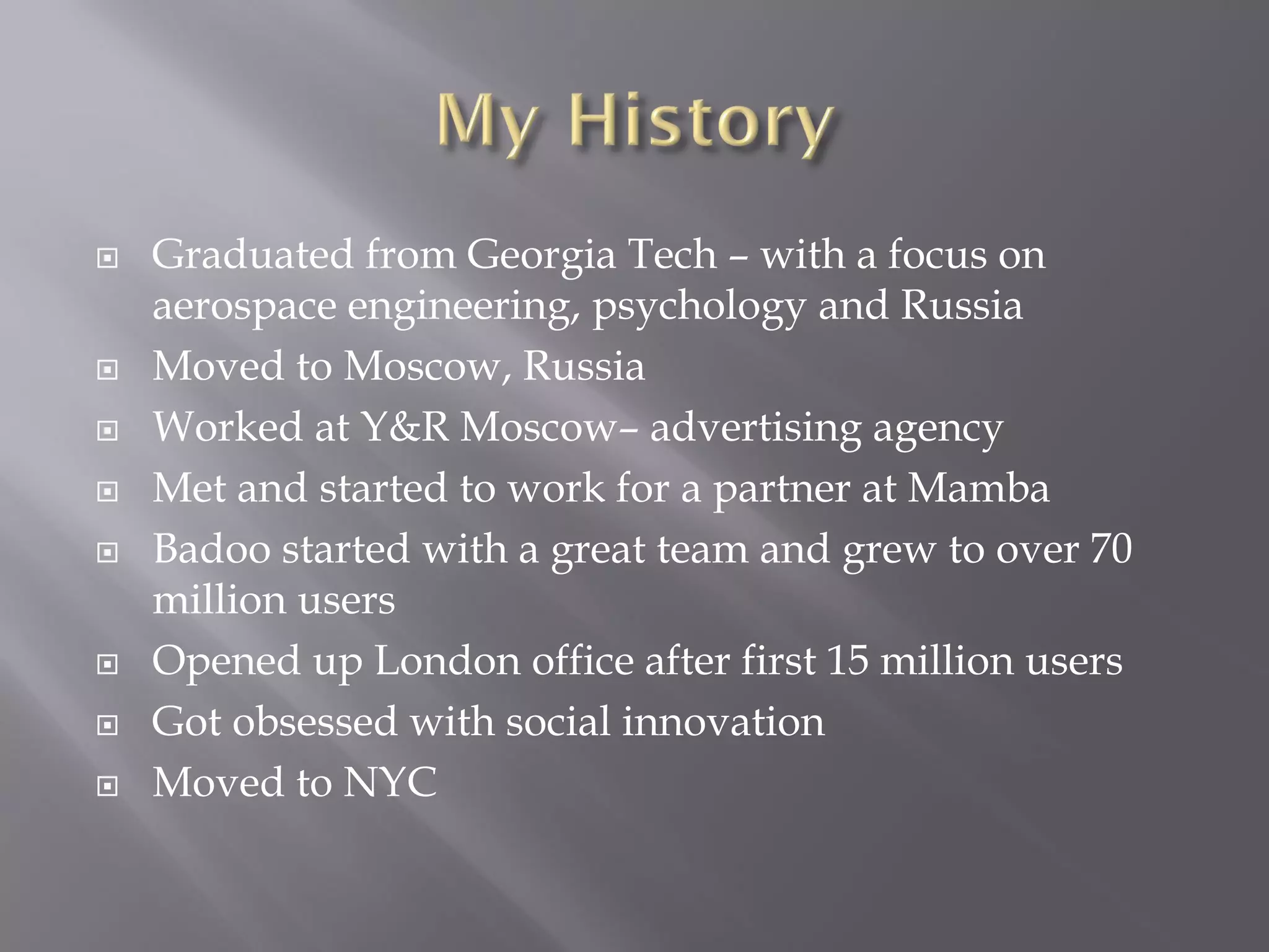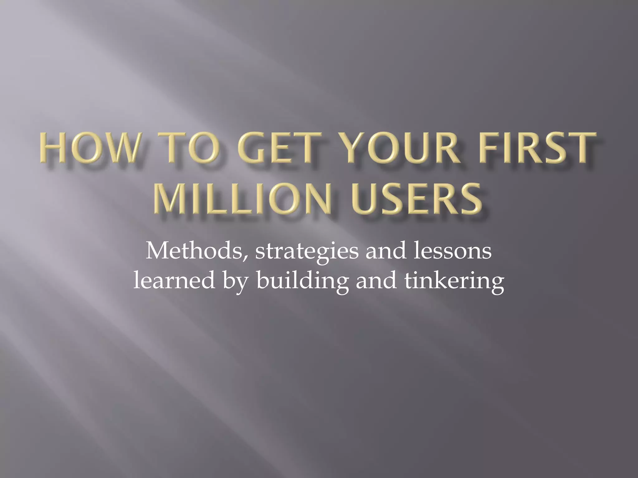 The document outlines strategies and insights from a professional with a background in aerospace engineering and advertising, detailing their experience in user acquisition for platforms like Badoo. Key elements include the importance of data analysis, user behavior measurement, and the effectiveness of viral marketing. It emphasizes that while a good product retains users, attracting them often requires marketing strategies beyond traditional public relations.