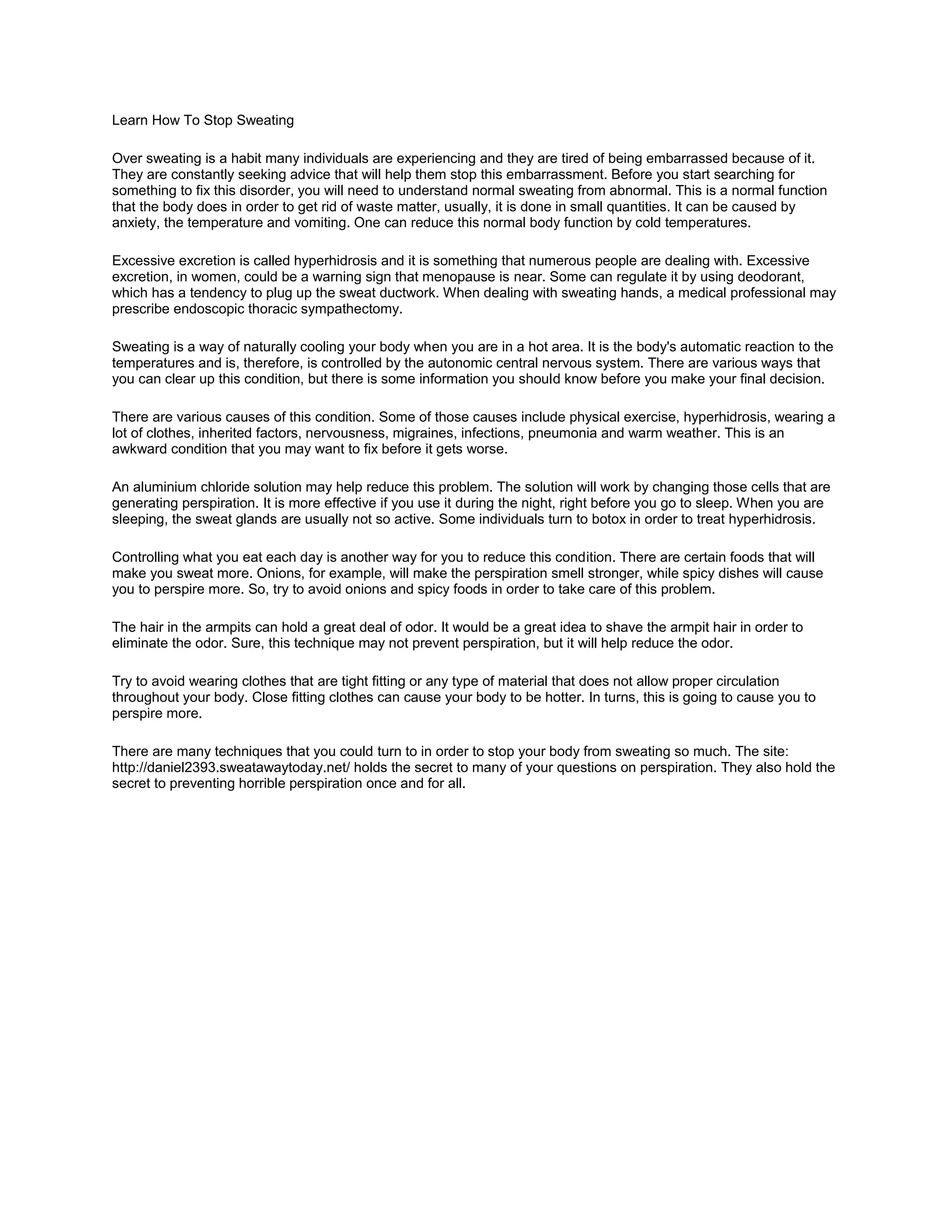 Excessive sweating, also known as hyperhidrosis, is a condition that many people experience and find embarrassing. There are various causes of hyperhidrosis including physical activity, nervousness, infections, and warm weather. Some ways to reduce excessive sweating include using aluminum chloride solutions, botox injections, controlling diet by avoiding spicy or onion foods, shaving armpit hair, and wearing loose fitting clothes for proper circulation. The website http://daniel2393.sweatawaytoday.net provides information and solutions for questions about excessive sweating and how to prevent it.