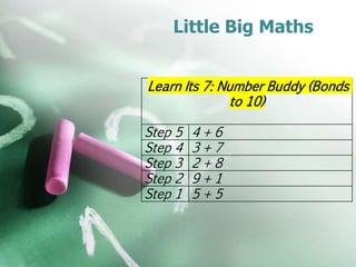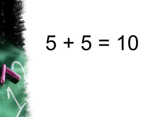 This document teaches number bonds to 10 through a series of steps showing different combinations that add up to 10. It starts with 5 + 5 = 10 and works backwards from larger numbers to smaller, showing 2 + 8, 3 + 7, and finally 4 + 6 all equal 10. It reinforces these number bonds through repetition.