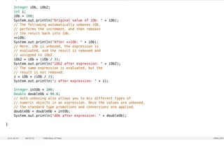 Java is a versatile programming language developed by Sun Microsystems in the early 1990s, initially named Oak and later renamed Java. It is characterized as a simple, object-oriented, distributed, interpreted, robust, and secure language that is platform-independent, with common applications in desktop, web-based, and mobile environments. The Java development process includes writing source code, compiling it into bytecode, and executing it on the Java Virtual Machine (JVM), which enables cross-platform compatibility.