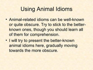 The document provides definitions and examples of common English idioms related to animals. It explains idioms such as "birds of a feather flock together" which means people who are alike tend to group together, and "killing two birds with one stone" which means accomplishing two tasks simultaneously. It also discusses idioms involving cats, chickens, horses, fish and other animals.
