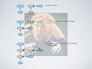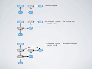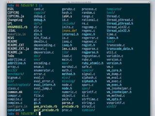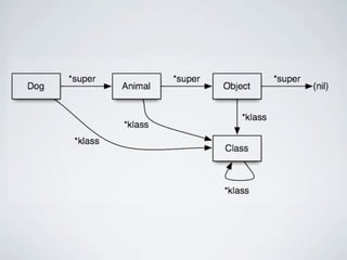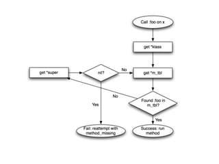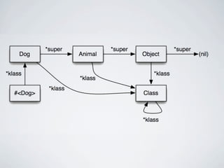 The document discusses learning Ruby by reading its source code. It provides an overview of Ruby's basic object structure, with every object having an RBasic struct containing flags and a klass pointer. It describes the various structs used to represent different Ruby object types like integers, floats, strings, arrays, and classes. It details how Ruby uses singleton classes to implement class and instance methods. The document also explores Ruby's approach to class inheritance and module inclusion by examining how method lookup and class hierarchies are represented internally. It encourages spelunking the C source code to better understand how Ruby works under the hood.