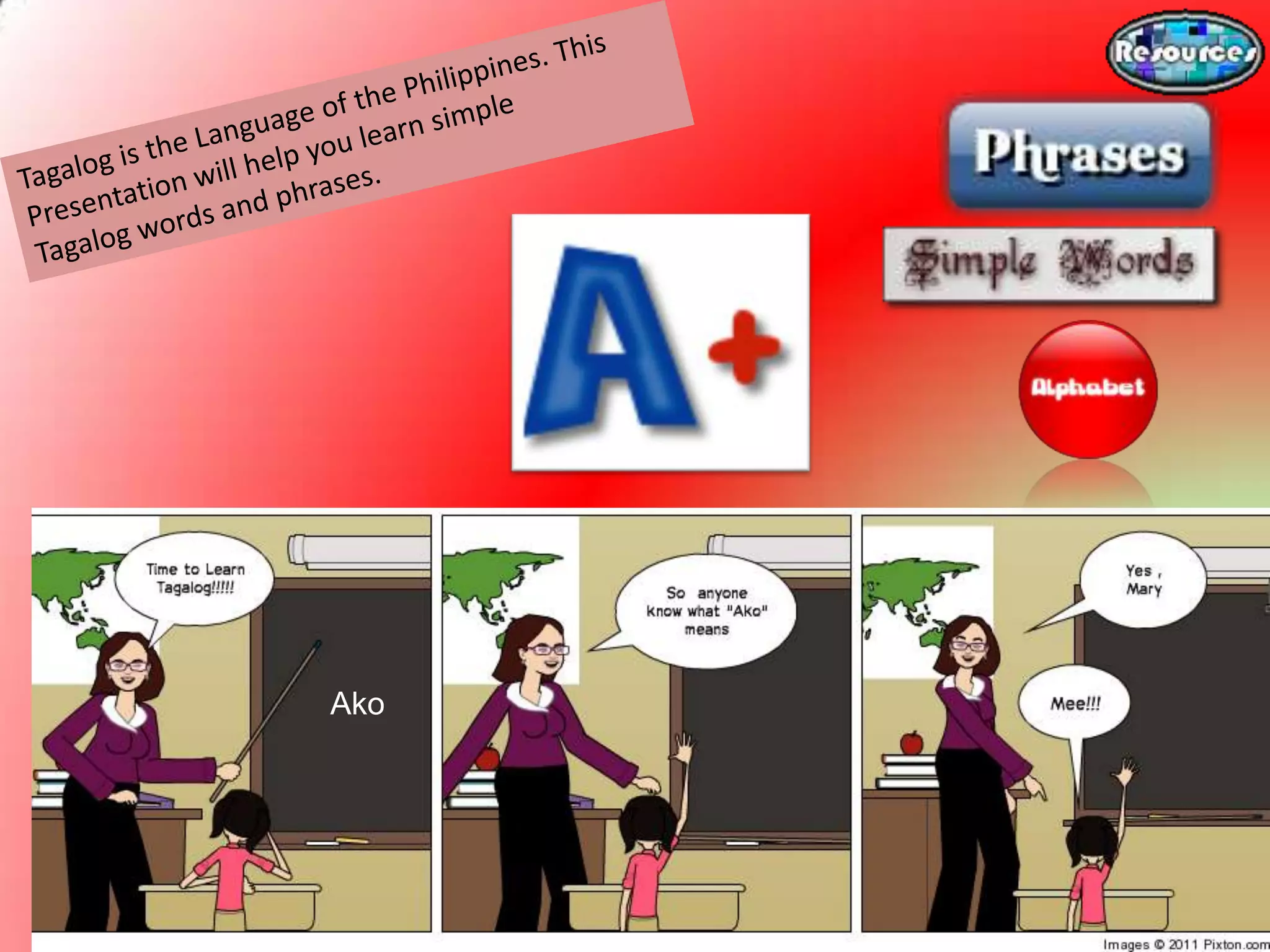 This document provides a summary of basic Tagalog words and phrases for communication in the Tagalog language. It includes Tagalog words for greetings like "Kumusta Ka" meaning "How are you", questions words like "Bakit" meaning "Why", and response words like "Oo" meaning "Yes" and "Hindi" meaning "No". It also includes the Tagalog alphabet and some notes on writing systems. Resources for making stylized text are listed at the bottom.