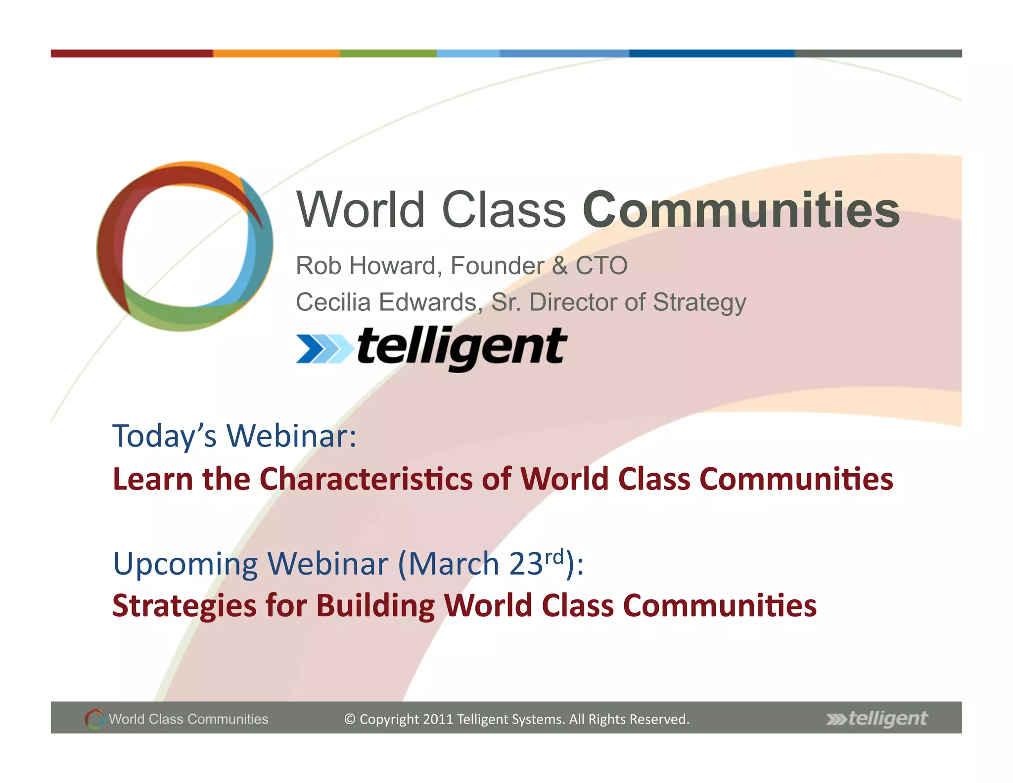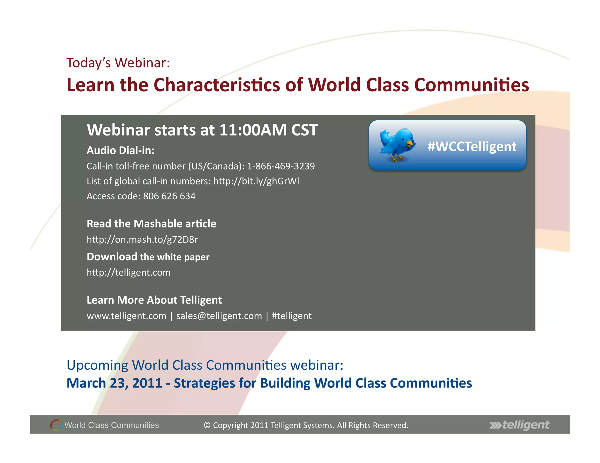 The document outlines an upcoming webinar hosted by Telligent on the characteristics and strategies for building world-class communities, scheduled for March 23, 2011. It emphasizes the importance of social interaction in business and provides nine key characteristics of successful communities, including a well-defined purpose and fostering a culture of belonging. Additional resources and contact information for Telligent are also included.