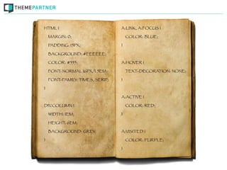 The document outlines the development and evolution of CSS, highlighting key milestones such as the recommendation of CSS1 in 1996 and CSS2 in 1998, and the mention of CSS3 in 1999. It emphasizes best practices for implementing CSS3 while ensuring compatibility with older browsers, alongside various examples of CSS techniques such as gradients, shadows, and transitions. The document concludes with a list of useful resources and a reminder to prioritize user experience in web design.