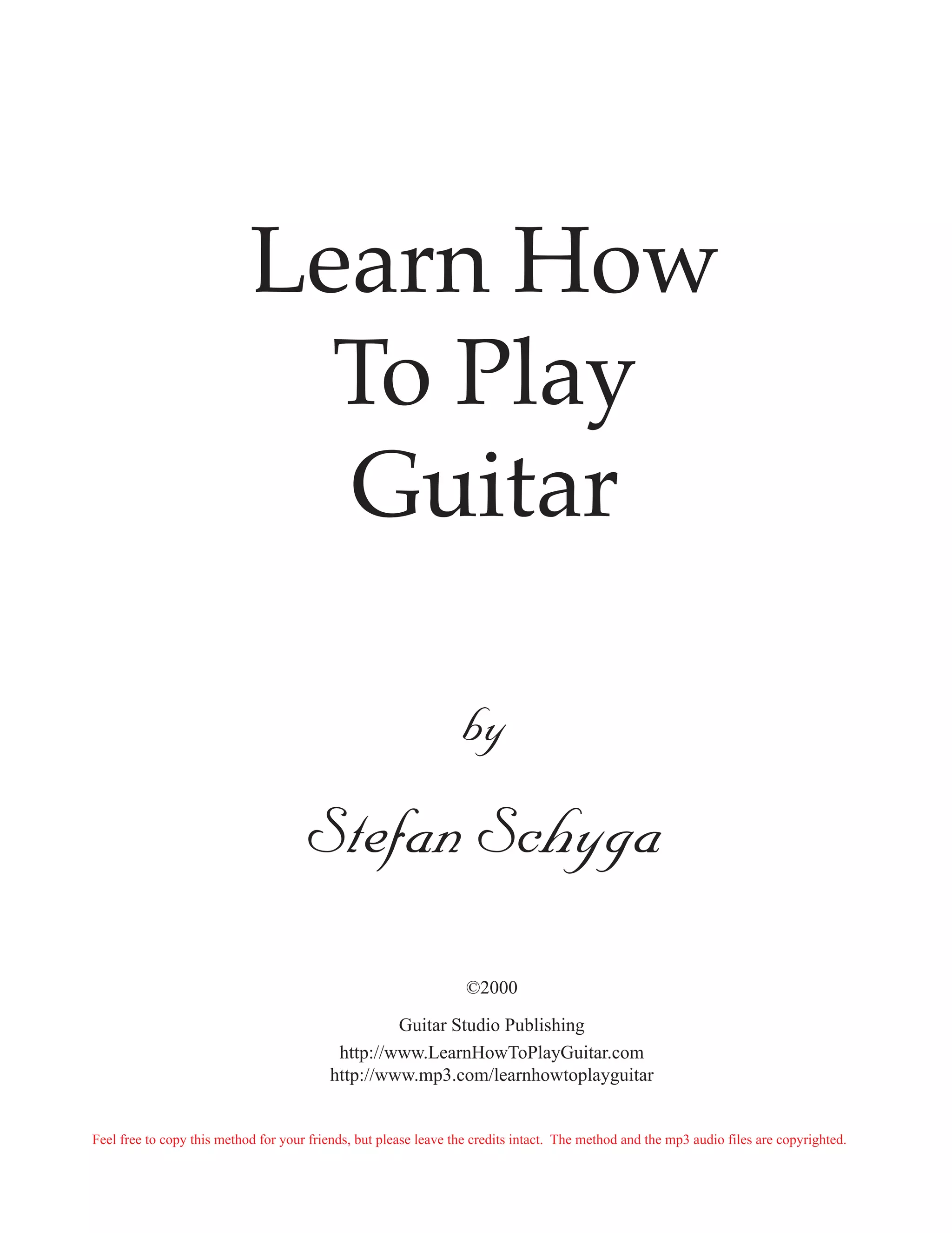 This document provides instructions for learning how to play guitar using a new method written by Stefan Schyga that teaches the basics of classical guitar playing in an effective and interesting manner over 27 lessons, covering topics such as tuning, notation, rhythms, notes on each string, scales, chords, and selected classical guitar pieces. The method is intended for adult learners who have no prior guitar experience but a desire to learn.