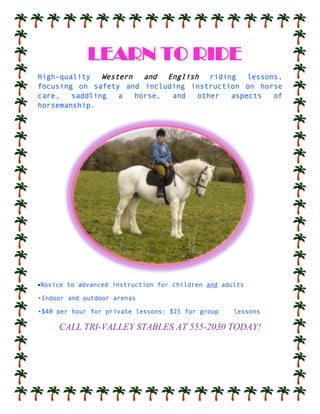 Tri-Valley Stables offers riding lessons focusing on safety and horsemanship, including horse care and saddling, for children and adults of all skill levels from novice to advanced. Lessons are available privately for $40 per hour or in groups for $25 per hour in indoor and outdoor arenas. To schedule a lesson, call Tri-Valley Stables at 555-2030.