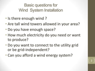 The document discusses key components and operating characteristics of wind energy conversion systems (WECS). It explains that WECS harness kinetic wind energy using turbine blades connected to a generator via gearboxes. The generator produces electricity from the rotational kinetic energy. Components like the tower, nacelle, rotor blades, low/high speed shafts, gearbox, generator, and electronic controller are described. Operating characteristics like cut-in speed, rated speed, and cut-out speed are also defined.