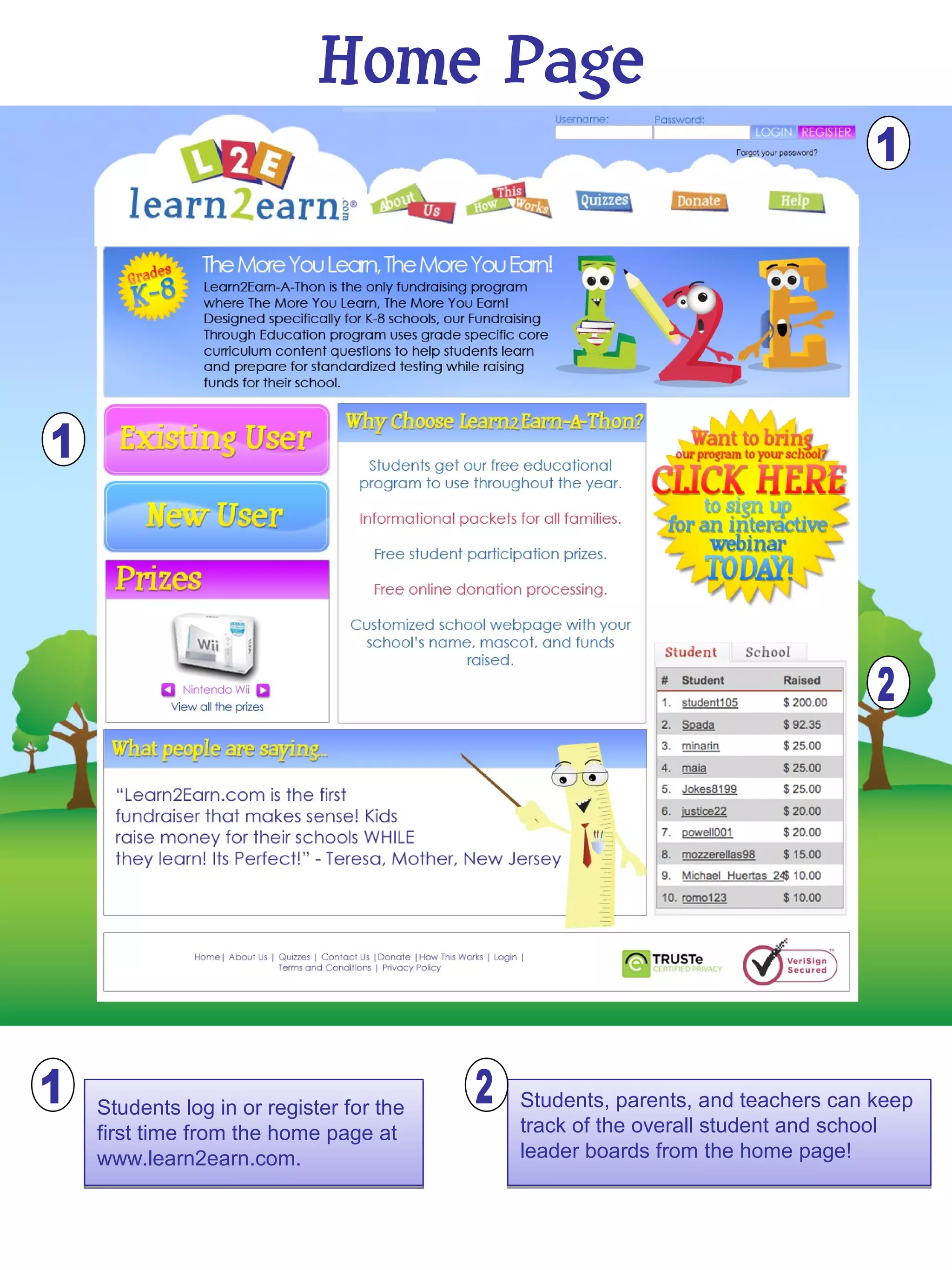 This document summarizes a fundraising program called Learn2Earn that is based around students answering educational quizzes online. Students and parents can register accounts and track progress on leaderboards. Students earn points for correct quiz answers that can be used to enter raffles. The program allows schools to customize their page and track fundraising stats. Sponsors can pledge donations that are secured online through an payment processor. Personal information is kept private and used only to credit students and deliver prizes.