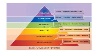The document discusses the various types and levels of learning as categorized by Dr. S. Jerslin and Gagne, highlighting eight learning types arranged from simplest to most complex. Learning is influenced by both internal and external conditions, and it emphasizes the importance of mastering foundational skills before moving on to higher levels. Additionally, it covers Bloom's Taxonomy, which outlines different cognitive levels of learning and provides strategies for studying and understanding material more effectively.