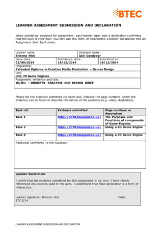 This document contains a learner assessment submission and declaration form. It provides information about the learner, assessor, program of study, unit, assignment details, evidence submitted for each task in the form of blog links, and an additional comments section. The learner, Brienna Hick, signs the declaration to confirm the work submitted is their own and references any sources used.