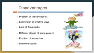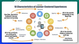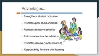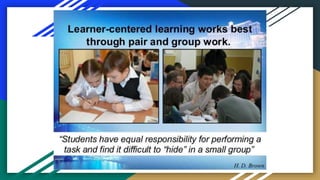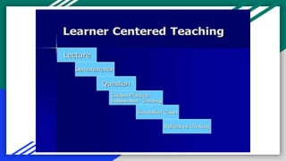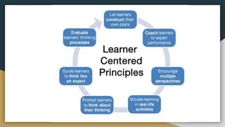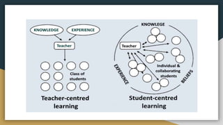 The document discusses learner-centered teaching, emphasizing its definition and characteristics compared to teacher-centered methods. It highlights the importance of two-way communication and self-evaluation in the learning process, as well as the advantages and disadvantages of this approach. Additionally, it references educational materials and authors related to the topic.