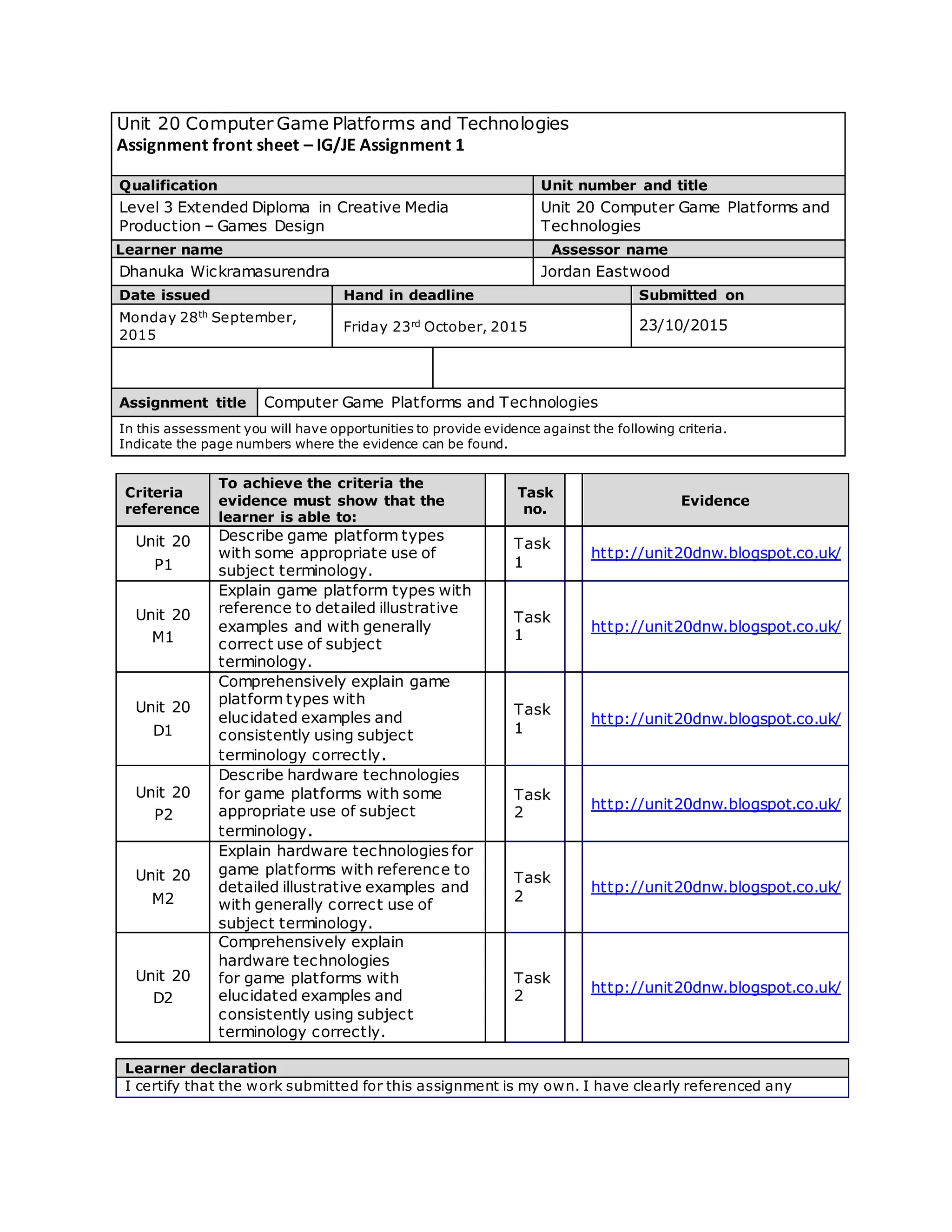 Learner signature: Dhanuka. W Date: 23/10/2015