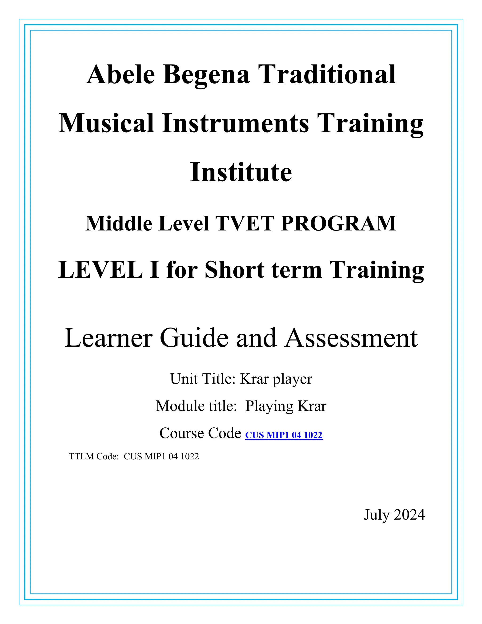 The document outlines a training curriculum for a music program focused on playing the krar, a traditional Ethiopian string instrument. It includes a detailed course outline, learning objectives, and assessment methods, aimed at equipping trainees with the skills to perform and organize traditional music. Additionally, the curriculum addresses the cultural importance of preserving Ethiopian music traditions through skilled training and employment opportunities.