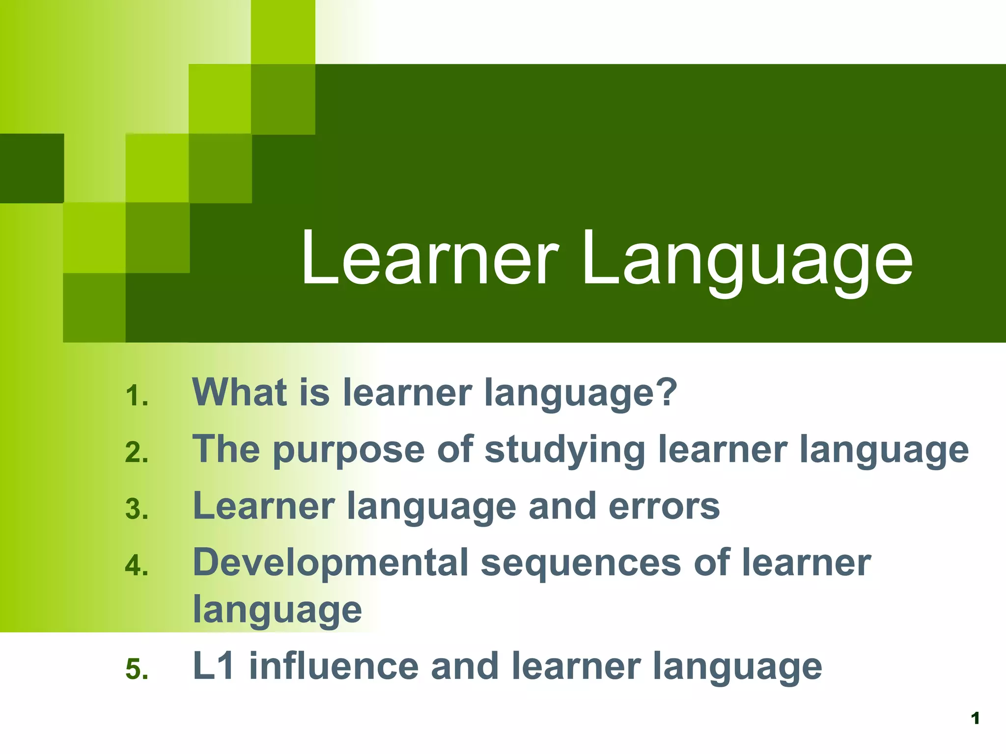 Learner language, also known as interlanguage, refers to a language system that develops between a learner's native language and the target language being learned. This developing system has characteristics of both the native language and target language, as well as general patterns that emerge across learners. Studying learner language and the errors they make provides insight into how learners acquire a new language over time and the developmental sequences they progress through, such as first acquiring simple grammatical structures before more complex ones. While the first language influences the interlanguage, many developmental patterns are similar across learners of different native languages.
