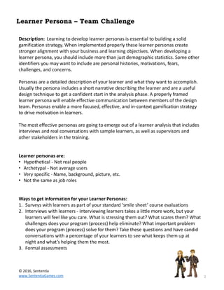 Learner personas are fictional representations of targeted learners created from real data and research to understand their demographics, behaviors, motivations, and challenges. They serve as a valuable design tool in developing effective gamification strategies and ensuring alignment with business objectives. Effective creation and use of learner personas involve interviews, qualitative and quantitative data, and empathy to enhance understanding of learners' needs.