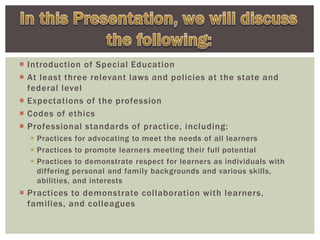 The document provides an overview of special education, highlighting key laws and policies at both state and federal levels, such as the Individuals with Disabilities Education Act (IDEA) and Section 504 of the Rehabilitation Act. It outlines expectations for professionals in special education, including ethical codes, standards for practice, and collaborative techniques to support diverse learner needs. Additionally, it discusses the commitment educators must have to their students and the profession to promote inclusive education and student growth.