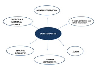 This document categorizes and defines different types of exceptionalities or disabilities that can affect learners. It discusses categories such as specific cognitive or academic difficulties like learning disabilities, ADHD, and speech/communication disorders. It also covers social/emotional and behavioral exceptionalities including autism, mental retardation, and emotional/conduct disorders. Additionally, it outlines physical disabilities and health impairments as well as sensory impairments involving vision, hearing, and giftedness. The document provides details on the characteristics and features of each exceptionality.