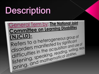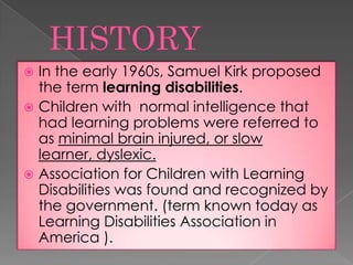 The document discusses the history and key aspects of learning disabilities. It notes that in the 1960s Samuel Kirk proposed the term "learning disabilities" to describe children with normal intelligence who had learning problems. The Achievement-Ability Discrepancy model required students to show a severe discrepancy between achievement and intellectual ability to be identified as learning disabled. Response to Intervention evaluates students' response to increasingly intensive instruction. The document also discusses genetic, medical, and environmental factors; common challenges students with learning disabilities face; and educational approaches used to help these students.