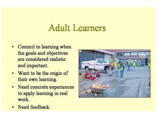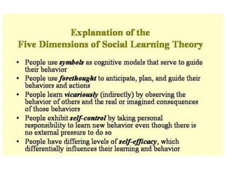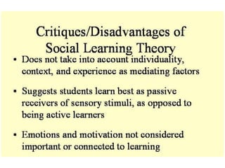 Stimulus-response theories propose that learning occurs through associations between environmental stimuli and behavioral responses. The three main theories are classical conditioning by Pavlov, instrumental conditioning by Thorndike, and operant conditioning by Skinner. Cognitive theories focus on mental processes like memory, problem-solving, and language that influence learning. Social learning theories emphasize that people can learn through observation of and interaction with others. Experimental learning theories propose that experience and reflection are central to learning new skills and concepts.
