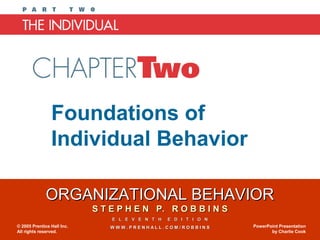 The document summarizes key concepts from Chapter 2 of Organizational Behavior by Stephen P. Robbins. It covers biographical characteristics, abilities, theories of learning, types of reinforcement schedules, behavior modification, and organizational applications of these concepts. The chapter objectives are to define biographical traits, abilities, learning theories, and the role of reinforcement and punishment in shaping behavior.