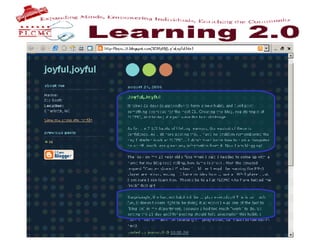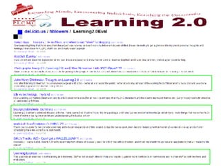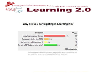 The document outlines an L2 program at a public library to introduce staff to new technologies through self-directed learning challenges. Over 500 staff participated in exploring tools like blogging, photos, RSS feeds, wikis and podcasts. The program emphasized discovery, sharing knowledge, and encouraging staff to have fun, take risks and learn from each other. It stresses the importance of transparency, trust and incentivizing participation for ongoing learning.