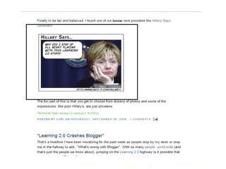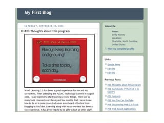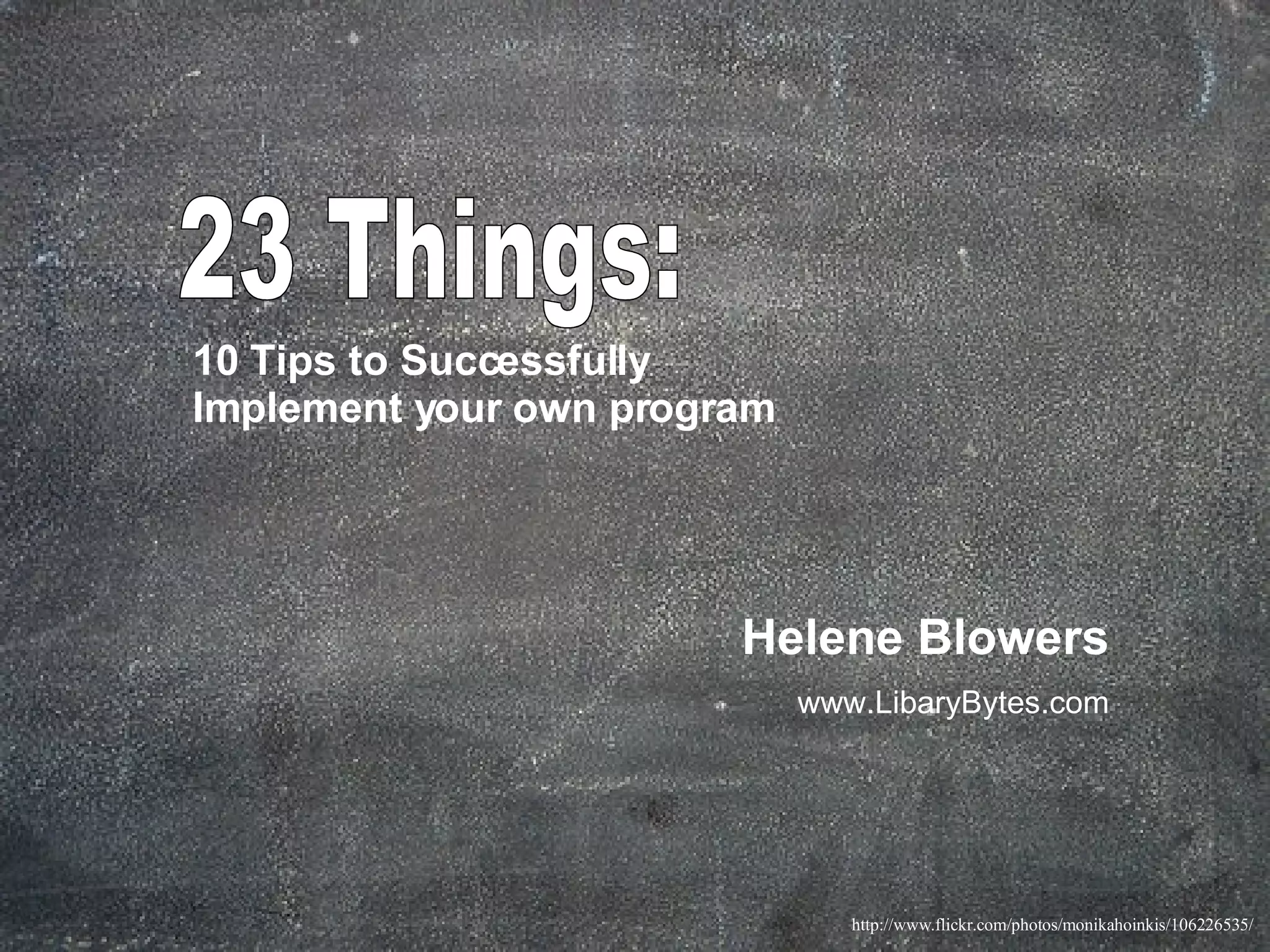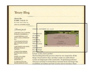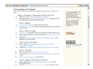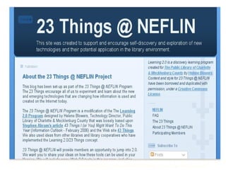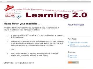 The document outlines a Learning 2.0 program to introduce library staff to new technologies over 9 weeks. It includes 10 tips for implementing such a program successfully, such as supporting staff learning, allowing anonymous blogging, focusing on discovery, and encouraging staff to use incentives and play. Staff feedback was positive, with many feeling it expanded their knowledge and comfort with technology. The biggest takeaway is that learning how to learn is the most important skill.