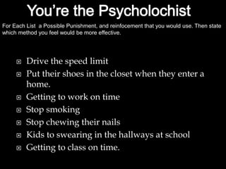 The document discusses different types of learning including classical conditioning, operant conditioning, and observational learning, noting that learning allows organisms to adapt to their environments through changes in behavior from experience; it also examines concepts such as reinforcement, punishment, and modeling behavior which are important aspects of how learning occurs.