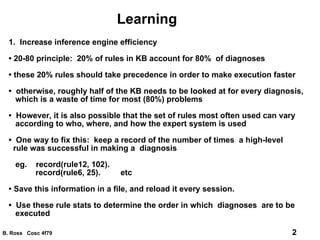 Machine learning is an area of AI concerned with automatic learning. Some ways ML can be used in expert systems include increasing inference efficiency, testing the knowledge base, and acquiring knowledge. The ID3 algorithm constructs a decision tree from a set of examples to derive production rules, aiming to find a small tree efficiently. It selects the attribute with the highest information gain at each node to minimize uncertainty. However, ID3 has limitations such as handling noise, continuous values, and verifying rules on a full dataset.