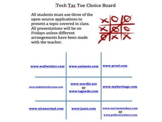 This document discusses using Web 2.0 tools and technologies to differentiate instruction and address 21st century learning standards. It provides examples of tools like Xtranormal, Show Me, QR codes, Wordle, Tagxedo, MakeBeliefsComix, Juxio, MyHeritage and Wallwisher that can be used for differentiated projects. Students are given choice in the tools they use through a Tech Tac Toe board. Differentiating instruction allows all students to learn in ways that engage their individual learning styles.