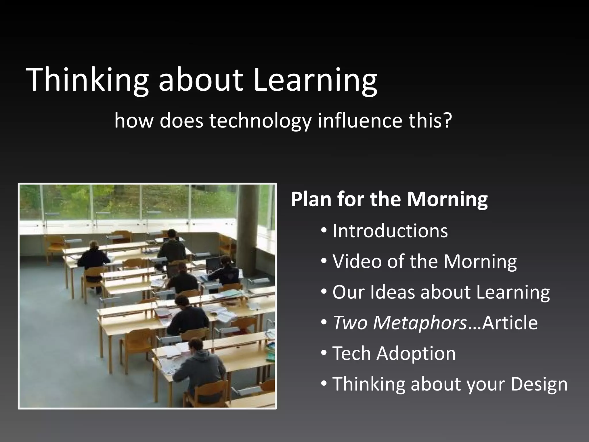 The document discusses how technology influences learning. It introduces a plan for the morning that includes introductions, a video, discussing ideas about learning, and examining two metaphors. It also mentions discussing technology adoption and thinking about design. Learning is described as active, constructive, and cooperative. While ideas are often oversimplified for teaching, all human behavior is goal directed. Technology traditionally supports teacher goals rather than learner goals. Three levels of technology adoption are defined: replacement, amplification, and transformation, with transformation requiring the most change to teaching, content selection, and learning outcomes.