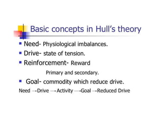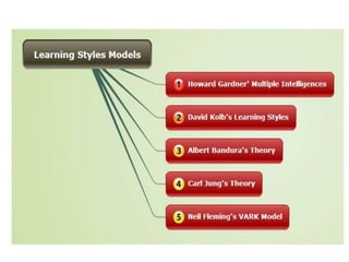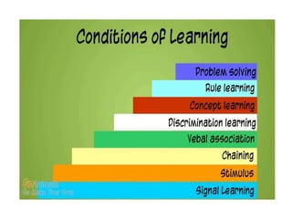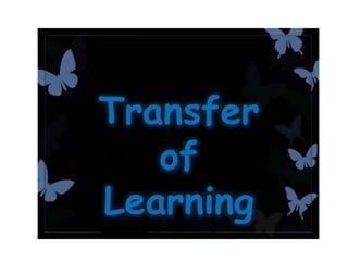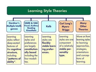 This document discusses various theories of learning including Thorndike's connectionism, Pavlov's classical conditioning, Skinner's operant conditioning, and Hull's reinforcement theory. It also covers concepts like transfer of training, learning styles, and metacognition. The key points are: