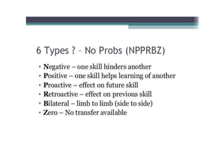 3) Transfer of training refers to applying what is learned in one context to another context. Several theories attempt to explain how and why