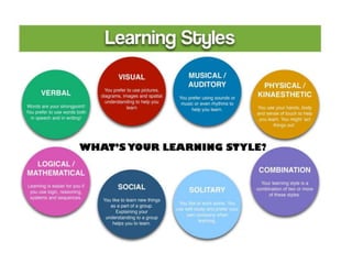2) Factors that influence learning include characteristics of the learner, the learning experiences, resources available, and motivation.