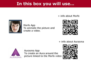 The document provides instructions for students to create augmented reality experiences by making animated videos of pictures using the Morfo app and then overlaying the videos onto the pictures using Aurasma. Students will choose a picture from options provided or draw their own, research the person, write a short bio in first person, record an introduction video using Morfo, and then use Aurasma to create an augmented reality aura that plays the video when the picture is viewed through the app. The goal is to bring pictures to life through animated introductions that are activated via augmented reality.